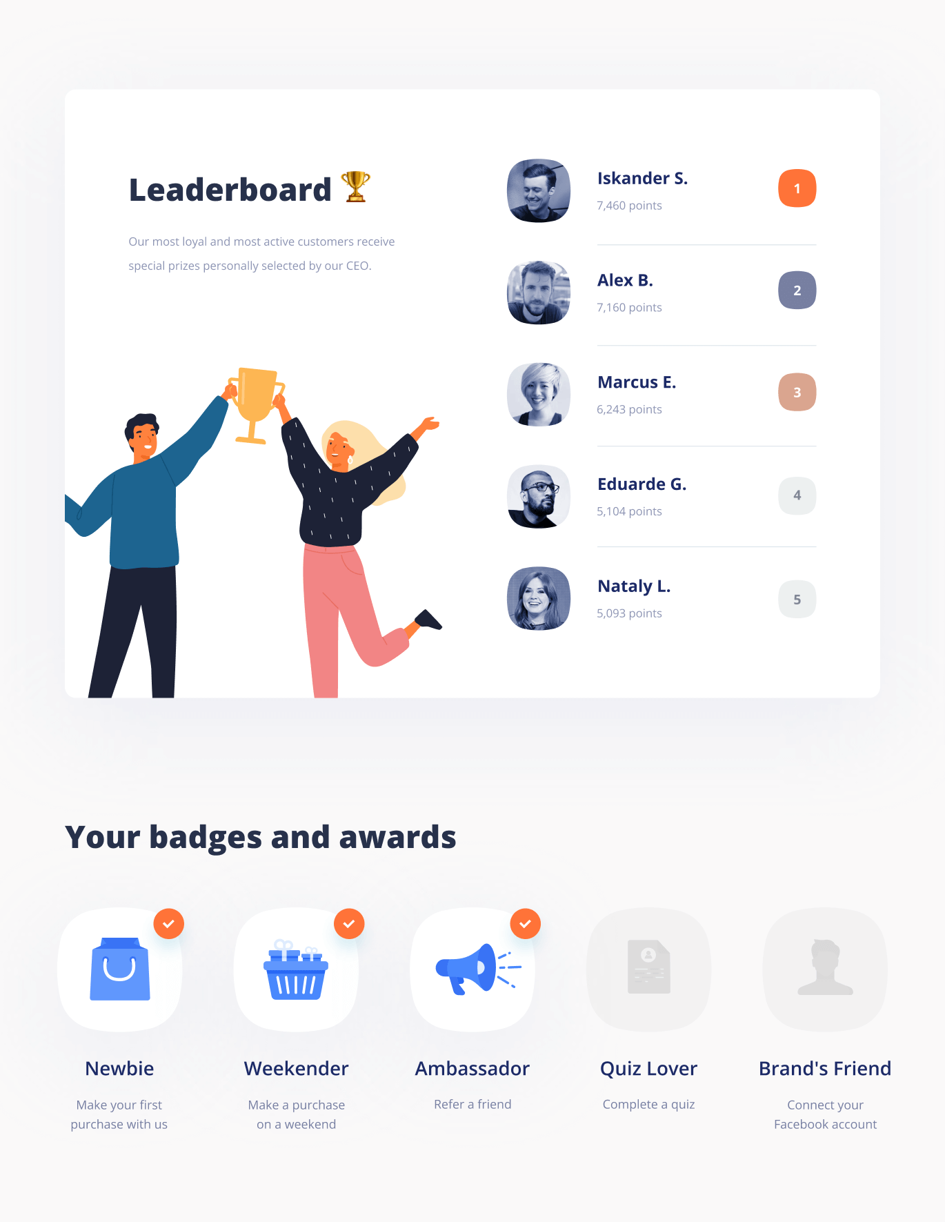 Повышайте лояльность клиентов такими игровыми механниками как лидерборды, прогресс-бары и бейджи