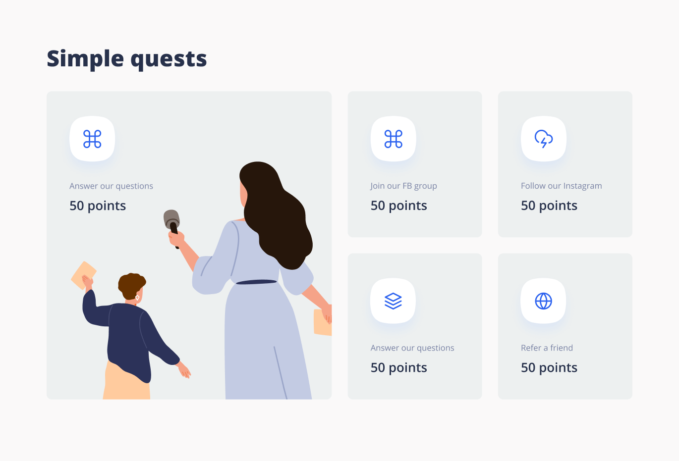 Настраивайте специальные задания для клиентов, комбинируйте их, создавая увлекательные квесты. Или используйте готовые шаблоны.